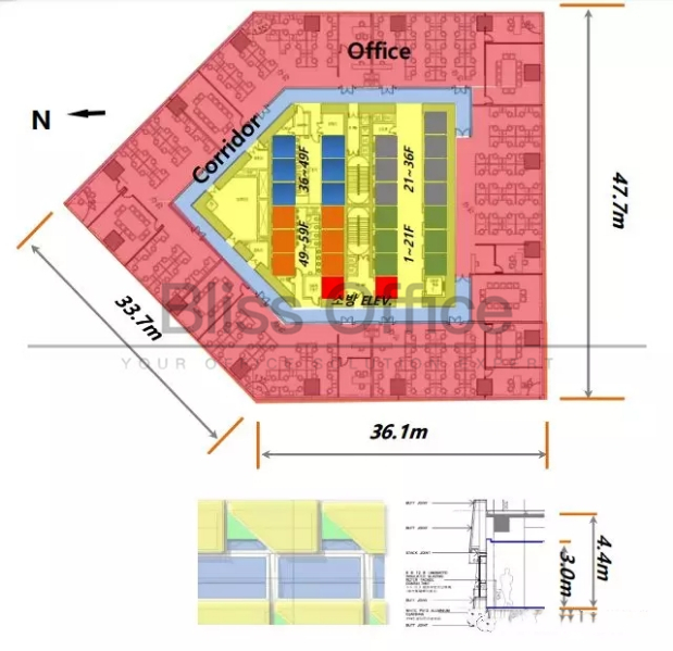 项目标准:3.0米净高,网络高架地板, 金属吊顶,单元近70%得房率